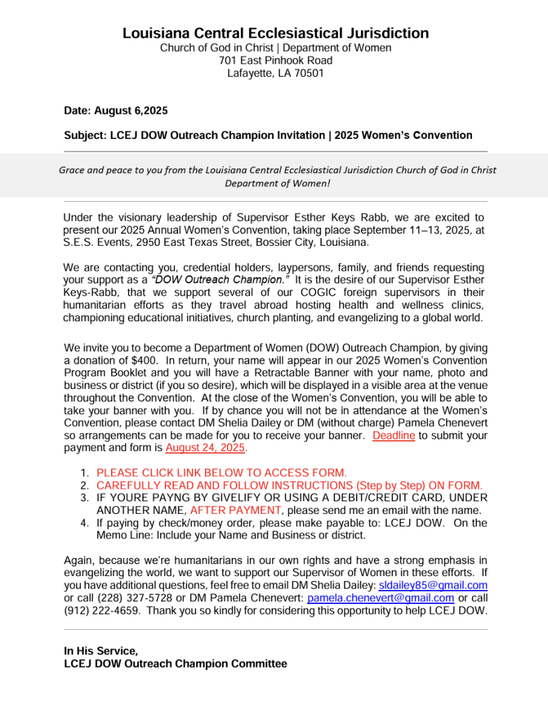 2025 OUTREACH CHAMPION LETTER CLICK THE BUTTON TO COMPLETE THE ONLINE OUTREACH CHAMPION FORM CLICK HERE - ONLINE OUTREACH CHAMPION FORM Downloadable/Fillable PDF Click the Fillable form link below The form is best viewed on a laptop or desktop computer for submitting. COMPLETE FILLABLE FORM